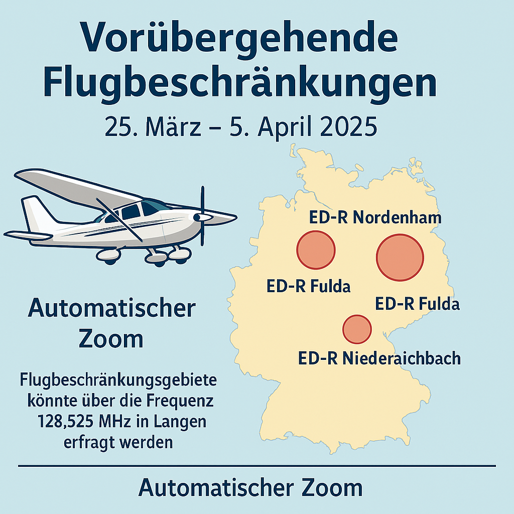 With effect from 25 March to 5 April 2025, the Federal Ministry for Digital and Transport Affairs (BMDV) has defined several temporary areas with flight restrictions in German airspace. The measure is in accordance with Section 17 (1) sentence 2 of the German Air Traffic Regulations (LuftVO) and relates in particular to the Bremen, Langen and Munich flight information regions. It is essential for general aviation to know and avoid these zones, as they have a direct impact on flight routes,